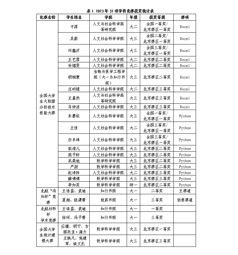 通过“冯如杯”、“统计建模大赛”、“大数据分析大赛”等学科竞赛,北航学子展现出了卓越的统计能力和综合素养,也激发了他们运用统计方法和大数据技术解决实际问题的热情。学科竞赛成果展示了澳门网投官方网站的校级一流本科课程《回归分析》《统计学导论》等统计课程的教学成果和育人成效,有力地支持了统计学国家级一流本科专业建设点和北航新文科的建设。