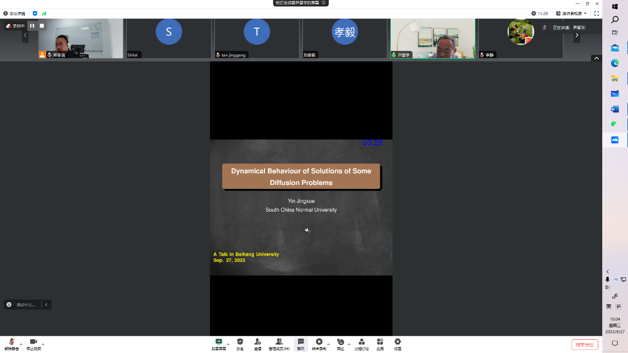 2023年9月27日上午,华南师范大学尹景学教授应邀为澳门网投官方网站师生做了题为 “Dynamical Behaviour of Solutions of Some Diffusion Problems”的学术报告。 此次报告由应用数学系郑孝信老师主持,相关研究领域的师生参加了本场报告。