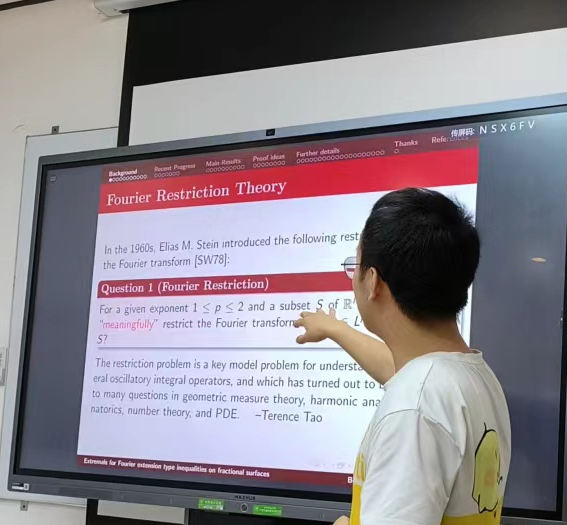 Fourier限制性问题是调和分析中的核心问题,分析学大师Stein在上世纪60年代提出了著名的限制性猜想,至今仍未解决,而对相关问题的研究吸引了众多国际著名数学家的关注。本次报告主要介绍了分数次曲面上的Fourier 延拓不等式的极值刻画。报告人首先介绍了Fourier 限制性问题,延拓不等式和Strichartz不等式的历史背景,然后介绍了一类分数次曲面上的不等式和极值问题,特别是极值函数列的紧性刻画,而这个不等式常用于对分数次 Schrödinger方程解的性质刻画。这些工作使用的工具主要包括profile decomposition,bilinear method, missing mass method等多种分析工具。