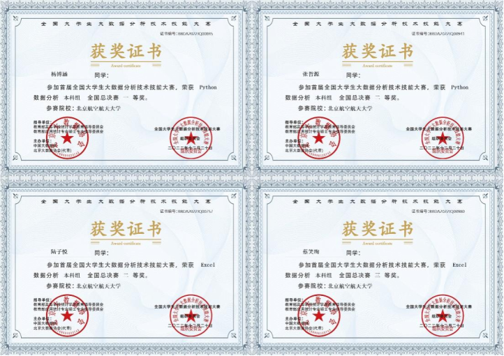 自本届比赛2022年8月启动以来,学院领导高度重视大力支持,统计与运筹系罗雪老师、刘超老师积极组织动员,我校共有24人次参加本次大赛,其中澳门网投官方网站20人,机械工程及自动化学院4人。通过刘超老师、戴蔚老师等的悉心指导,在省级赛中,24名参赛同学在万余名选手中脱颖而出,获得北京赛区一等奖4项、二等奖4项、三等奖6项等14项奖励。其中,我院本科生杨博涵、张哲源、蔡笑绚以及机械工程及自动化学院陆子悦等4名一等奖获得者晋级全国总决赛,经过激烈角逐,最终获得全国一等奖1项、全国二等奖2项和全国三等奖1项的优异成绩,同时获得北京大数据协会《初级数据分析师》证书。与此同时,刘超、戴蔚两位老师获得指导教师奖。