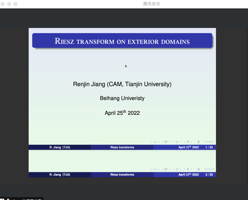 2022年04月25日,天津大学蒋仁进教授,应邀为澳门网投官方网站师生做了题为 “Riesz transform on exterior domains”的学术报告,报告由张安老师主持。