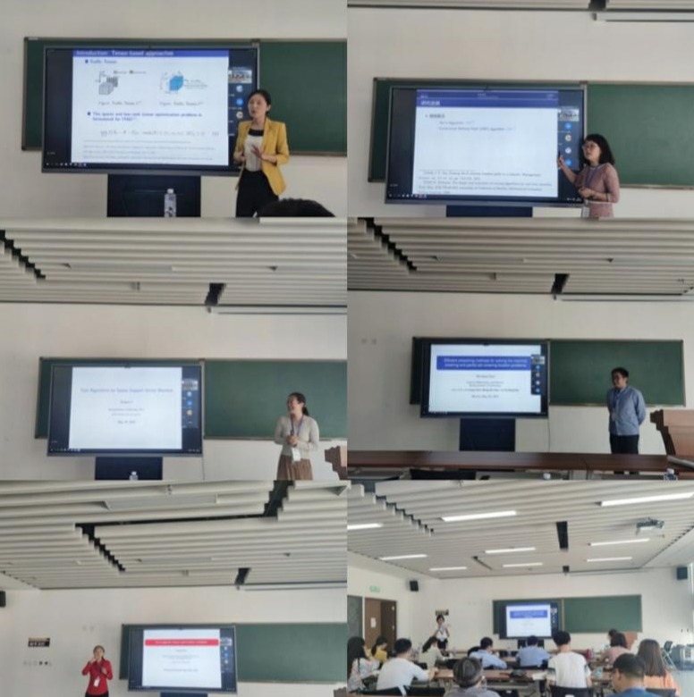 上午的报告人有中国科学院数学与系统科学研究院刘歆研究员和刘亚锋副研究员、中国科学院大学韩丛英教授、清华大学张立平副教授。刘歆研究员以主成分分析为背景,介绍了一种低秩矩阵分解的安全的分布式算法,该算法具有较低的通讯代价;韩丛英教授针对组合优化中的背包与选址问题,提出了一种深度强化学习算法,其对背包问题具有很强的时间优势;刘亚锋副研究员报告了在通讯用户数量变多的背景下,大规模MIMO检测的理论和算法;张立平副教授报告了四元数的三阶张量相关内容,通过对此类张量做低秩奇异值分解可以分析和处理彩色视频。