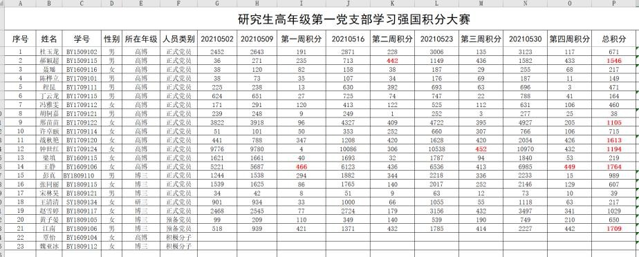 20215月,为深入开展党史学习教育,进一步强化党员的学习意识,培养党员的学习习惯,研究生高年级第一党支部依托“学习强国”平台组织开展学习。51日,支部在学习强国平台上成立了学生小组,支部党员全部加入,通过学习小组的实时积分排名激发党员同志们的学习热情,激励党员同志们通过每日的努力学习获得积分。自53日起持续至530日,开展“学习强国”积分大赛活动,为期28天,连续4个星期。
