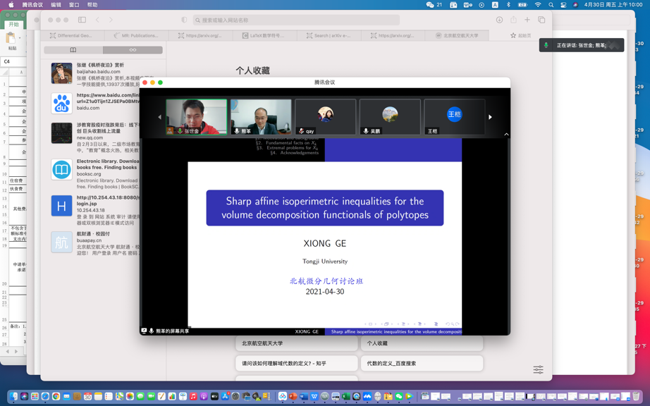 2021年4月30日上午,同济大学数学学院熊革教授受邀为澳门网投官方网站师生做了题为“Sharp affine isoperimetric inequalities for the volume decomposition functionals of polytopes”的线上学术报告,报告由张世金老师主持。此报告为数学学院几何团队每周五上午讨论班的学术报告。