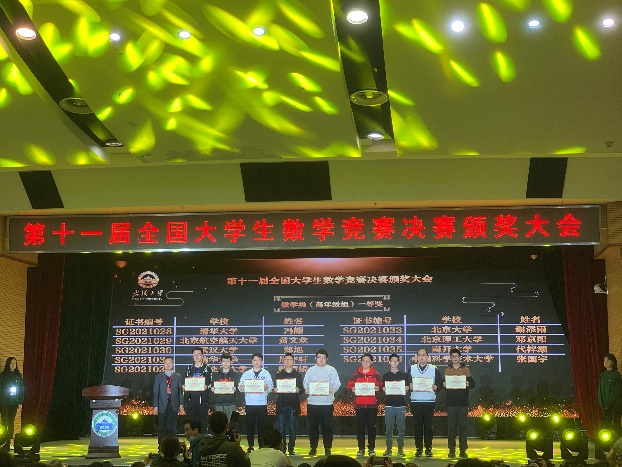 2021年4月18日,因新冠疫情延期举行的第11届全国大学生数学竞赛决赛于武汉大学成功举行。我校共有6名同学入围本次决赛,全部在决赛中斩获奖项。在数学类决赛中,黄文欢、李佳磊两位同学分别获得一等奖、二等奖;在非数学类决赛中,我校南军锋同学获得一等奖,武东弋、陈宇轩同学获得二等奖,韩程凯同学获得三等奖。