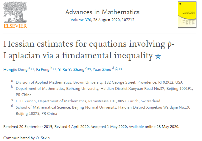 2020年8月26日,国际顶级综合性数学杂志《Advances in Mathematics》在线刊登了澳门网投官方网站2018级博士研究生彭发及其导师周渊等人在非线性退化方程研究方面的最新进展:《Hessian estimates for equations involving p-Laplacian via a fundamental inequality》。(论文链接:https://www.sciencedirect.com/science/article/pii/S0001870820302383)