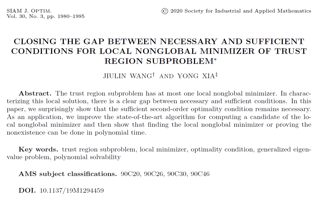 日前,我校澳门网投官方网站夏勇教授和2017级博士研究生王玖鳞在著名的信赖域子问题的局部非全局解的最优性条件刻画上取得重要进展,解决了该领域一个困扰27年的数学难题。研究成果“Closing the gap between necessary and sufficient conditions for local non-global minimizer of trust region subproblem”发表在《SIAM Journal on Optimization》,该期刊为数学优化领域权威期刊,2019年影响因子为2.247,期刊副主编认为该项工作是“对非线性规划文献的坚实贡献”(英文原文为“solid contribution to the nonlinear-programming literature”)。(论文链接:https://epubs.siam.org/doi/pdf/10.1137/19M1294459)