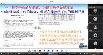 北航学院和佩佩老师,从数学分析课程群与北航学院在线授课联络员的角度,对课程群全体老师的辛苦工作表示由衷的感谢,并对下学期开课如何保持本学期优良作风提出了建议。助管江南同学及助教李芹芹、厉铮泽同学从助教的角度分享了本学期在线教学的感受。自由发言阶段,课程组的老师们都踊跃发言,总结本学期工作经验,就下学期教学工作展开讨论。