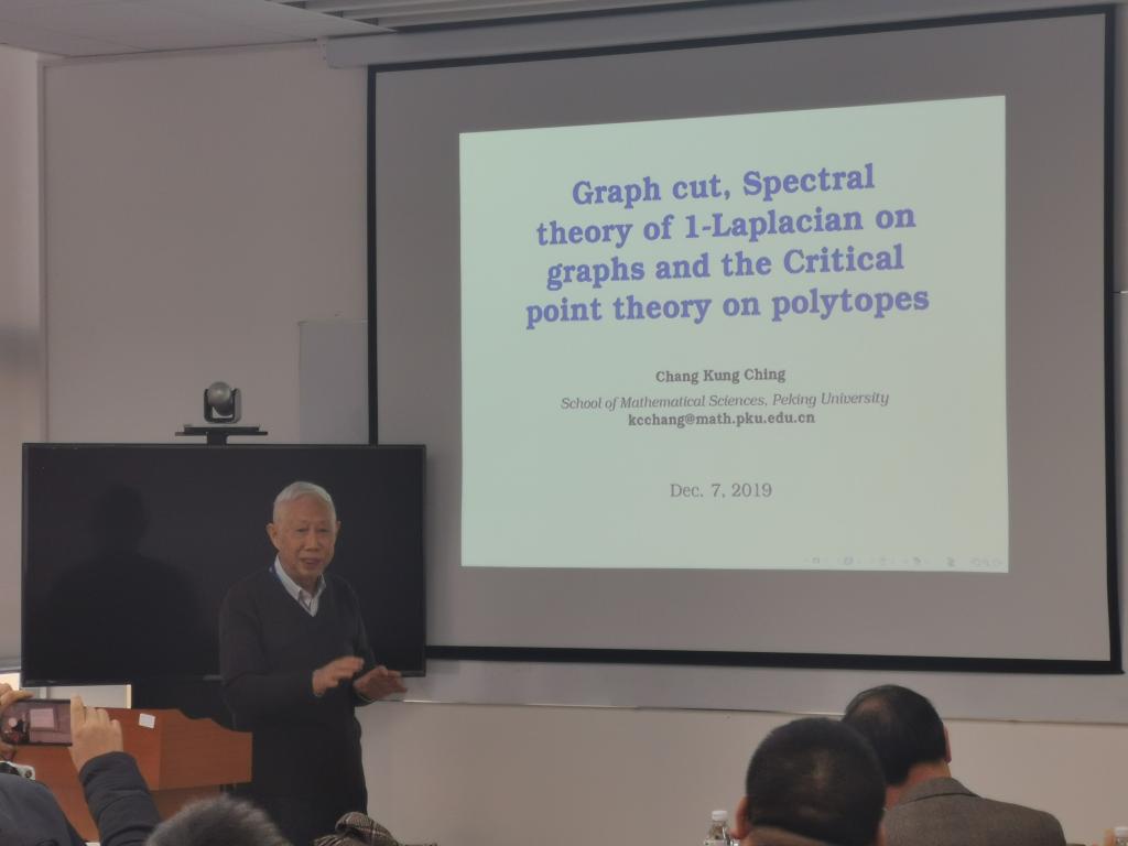 中国科学院院士,世界科学院士,张恭庆教授做了精彩报告,介绍了关于非光滑临界点理论的最近工作,并将其运用于图分割问题中,为这一问题的计算中许多基于实践的方法提供了严格的数学依据,尤其是给出了Cheeger常数与Mountain Pass点之间的漂亮关系。