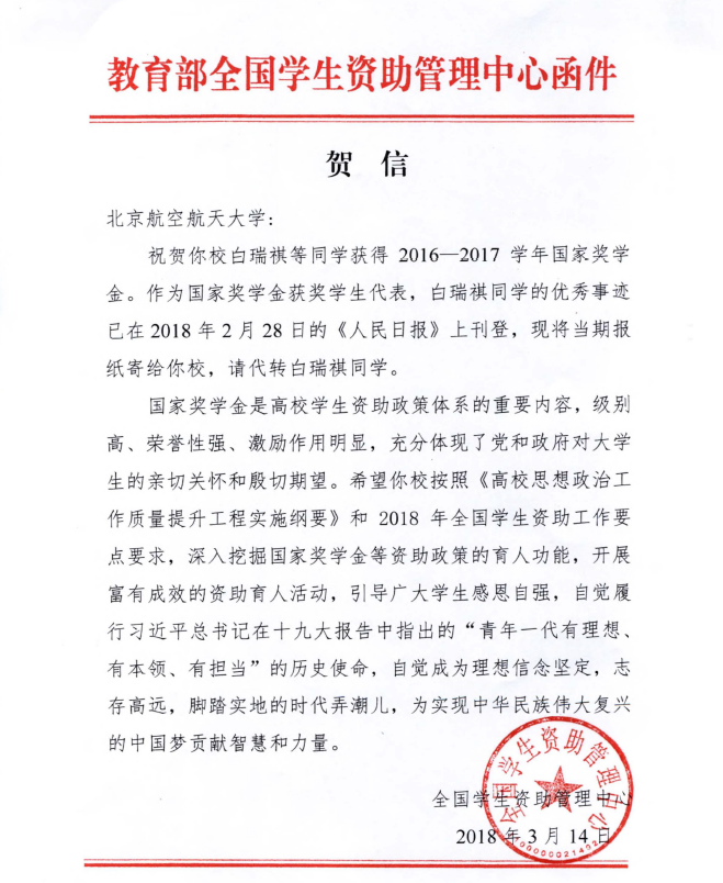 为激励青年学生坚定理想信念,志存高远、脚踏实地,勇做时代的弄潮儿,教育部全国学生资助管理中心从各省(自治区、直辖市)和各高校推荐的2017年国家奖学金获奖学生代表中遴选出100名优秀典型代表,我院白瑞祺同学当选,《人民日报》于2018年2月28日版刊登了白瑞祺同学优秀事迹。