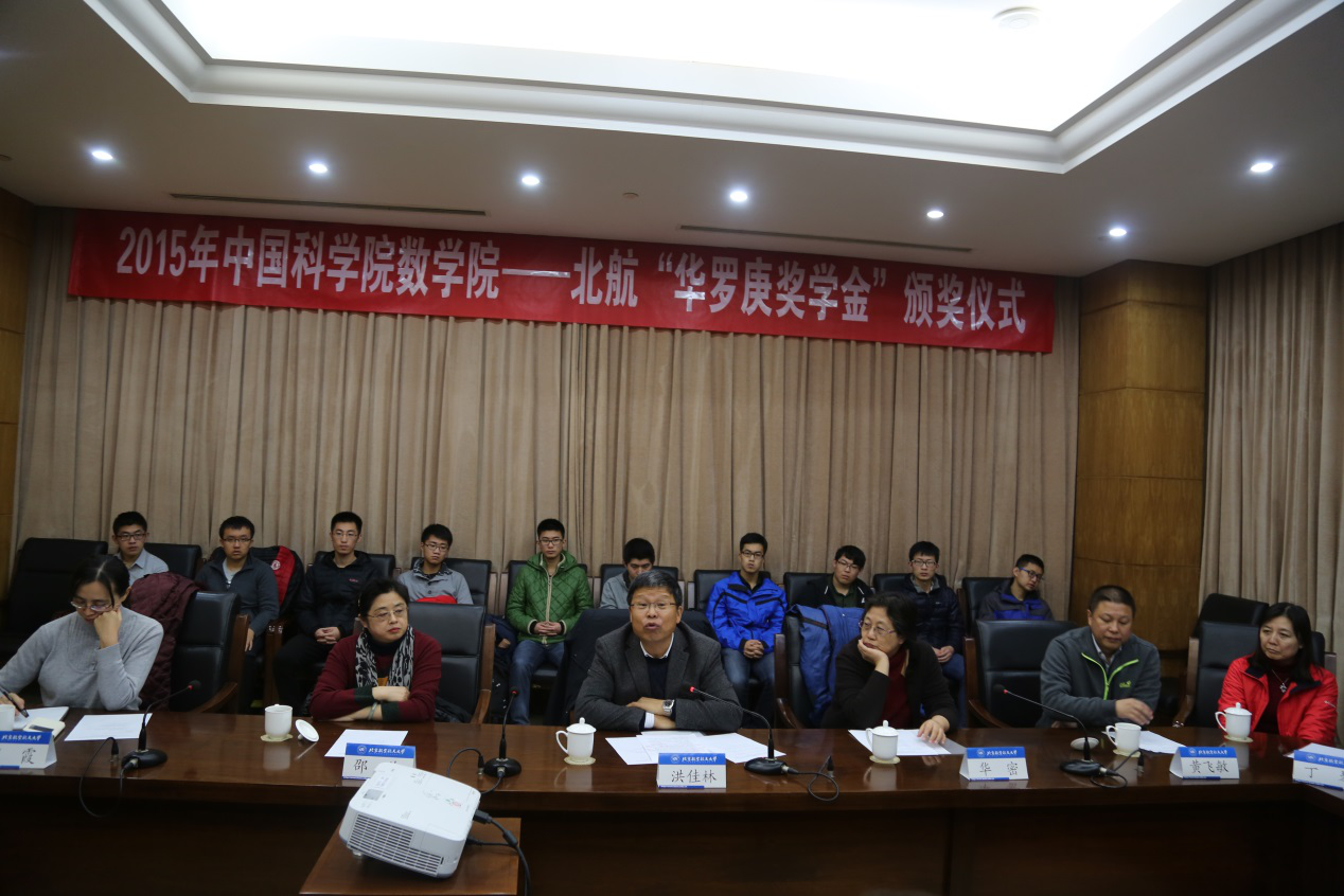 11月20日,2015年中国科学院数学与系统科学研究院——澳门网投官方网站“华罗庚奖学金”颁奖仪式在新主楼第五会议室举行。澳门网投官方网站纪委书记、工会主席纪素菊教授、中国科学院数学与系统科学研究院副院长洪家林研究员,华罗庚女儿华密女士出席了颁奖仪式并致辞。颁奖仪式由北航数学学院院长郑志勇教授主持。