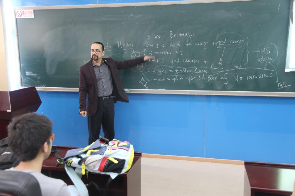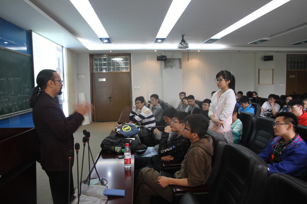 Lima-Filho教授首先向同学们展示了美国德克萨斯A&M大学理学院(TAMU Science Department)近年来的办学及发展概况,并详细介绍了理学院各个数学专业方向的人才培养计划包括各类专业所修的课程清单及未来就业方向。接下来他为大家介绍了“BUAA- TAMU数学专业本科生快车道”这一国际交换项目的具体情况,即在北航数学学院完成前三年的学业后申请去TAMU继续读一年的graduate和undergraduate混合的课程,然后由学生学习情况决定在接下来的一年内读完Master Degree或是直接去攻读PHD。接下来的互动交流环节中,同学们就当前关心的申请问题以及未来规划向Lima-Filho教授踊跃提问,教授清晰亲切的一一作答也解答了同学们心中存在的疑虑。此次座谈会进一步推进了我院与美国德克萨斯A&M大学的沟通,也为2015年华罗庚班的国际交流计划的实施拉开序幕。