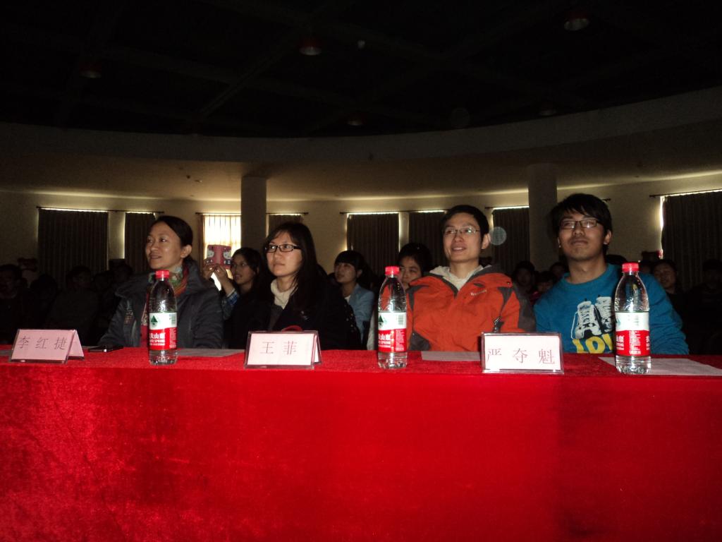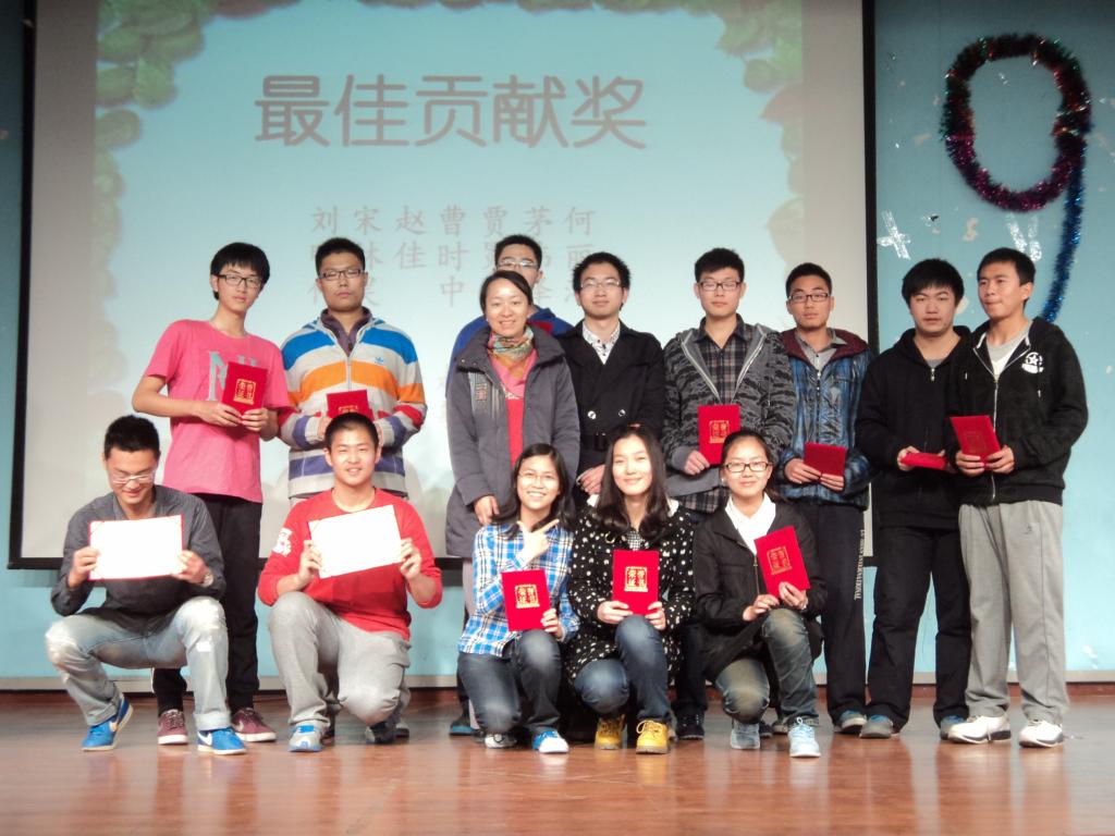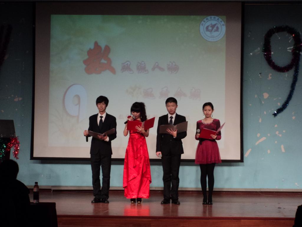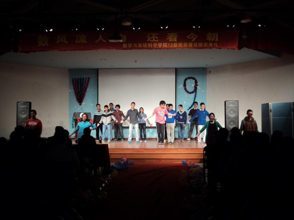 3月30日,我院12级班级建设颁奖典礼在沙河校区多功能厅举行。到场的有学院分党委书记李红捷老师,学院分党委副书记王菲老师,120921班班主任严夺魁老师,1209的辅导员张文浩和12级全体同学。颁奖典礼的主题是“数风流人物,还看今朝”,总结了在过去一个学期中,1209大班学习、班级工作等各方面的先进人物。活动以120921班的舞蹈“Together”开场,李红捷书记在舞蹈之后亲自为获得“最佳贡献奖”的同学颁奖,他们在过去的一个学期中,承担了大量的集体工作,为大班建设作出了突出的贡献。接着颁奖人颁发了“学爸学妈”“单科最高”等一系列学习奖项,在23班朗诵的《数的诗》之后,活动开始了对大班各类特色奖项的表彰。其间的“歌词曲目大反串”掀起了典礼的第一波高潮,21班的班主任严夺魁老师亲自上台放歌,使气氛更加热烈。在随后的一系列的奖项中穿插着22班的相声《露一手》、24班的小品《考试》、23班的《天下无贼》的片段以及华罗庚班带来的歌曲《菊花台》等精彩的节目,典礼的颁奖环节在轻松愉悦的氛围中结束。之后,辅导员张文浩做了简短的活动总结。长达两个小时的颁奖典礼是1209大班成立以来的总结,活动不仅给12级同学带来了深深地感触,也是大家难忘的回忆,一系列的奖励和表彰为大班发现了各有所长的先进代表,也为同学树立了榜样。 活动在最后一个节目歌舞剧《老男孩》的歌声中圆满结束。