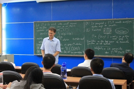 访问期间,C. Blohmann研究员除为我校师生做了一系列的学术讲座外,还为我校学生介绍了德国数学现状,人才培养及研究生教学培养体制和奖学金制度等,认真回答了大家关于留学德国的问题,使大家获益匪浅。9月20日下午,C. Blohmann博士还为北航数学论坛作了一场题为“Groupoids: A tour by examples”的精彩报告。他从广义群的由来及大家熟知的例子出发,自然地引入了广义群的概念,并进一步介绍了广义群与广义群卷积、矩阵论、拓扑广义群、广义群代数、流形等重要数学理论间的密切联系,带领大家初步了解了广义群的重要性。并在讲座结束时认真而详细地回答了大家踊跃提出的学术问题。
