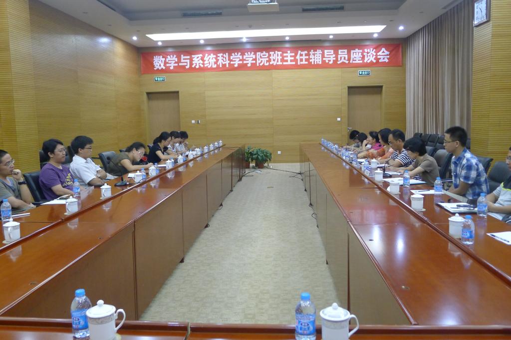 2012年8月31日上午,数学与系统科学学院班主任辅导员座谈会在新主楼第八会议室举行。出席会议的学院领导有院长郑志勇、党委书记李红捷、副院长李翠萍、副书记王菲,教务处副处长王敏作为特邀嘉宾出席了座谈会,此外,全院本科各年级班主任、辅导员20余人参加了会议。