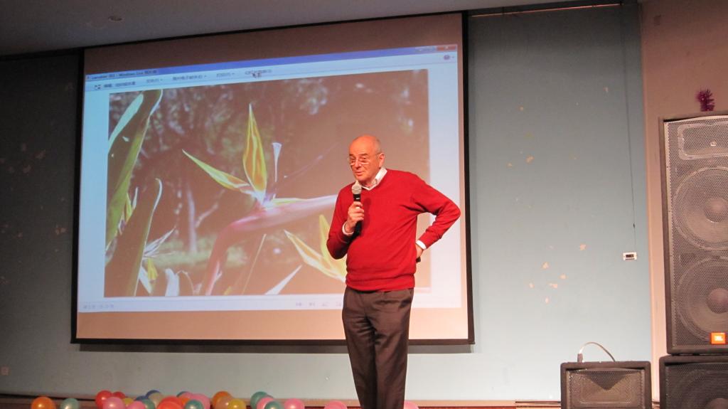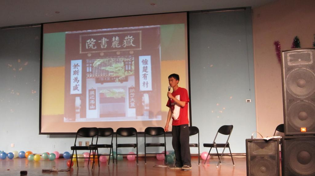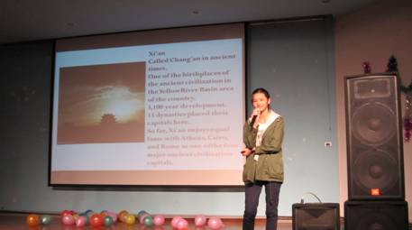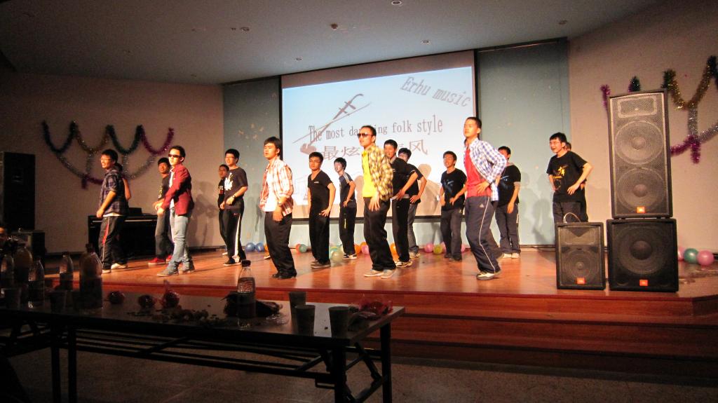 在晚会上,同学们向Peyriere教授介绍了自己的家乡,展示了祖国的大好河山。老师也十分有兴致地通过照片的形式给同学们讲了他在法国的故事,大家感受到了浓浓的异域风情。之后,11级华罗庚班同学们表演了充满活力的集体舞《最炫民族风》,着实让全场眼前一亮。最后,石雅克老师还欣赏了11级同学们表演的话剧《big bang》,晚会在大家的欢笑声中画上了完美的句号。