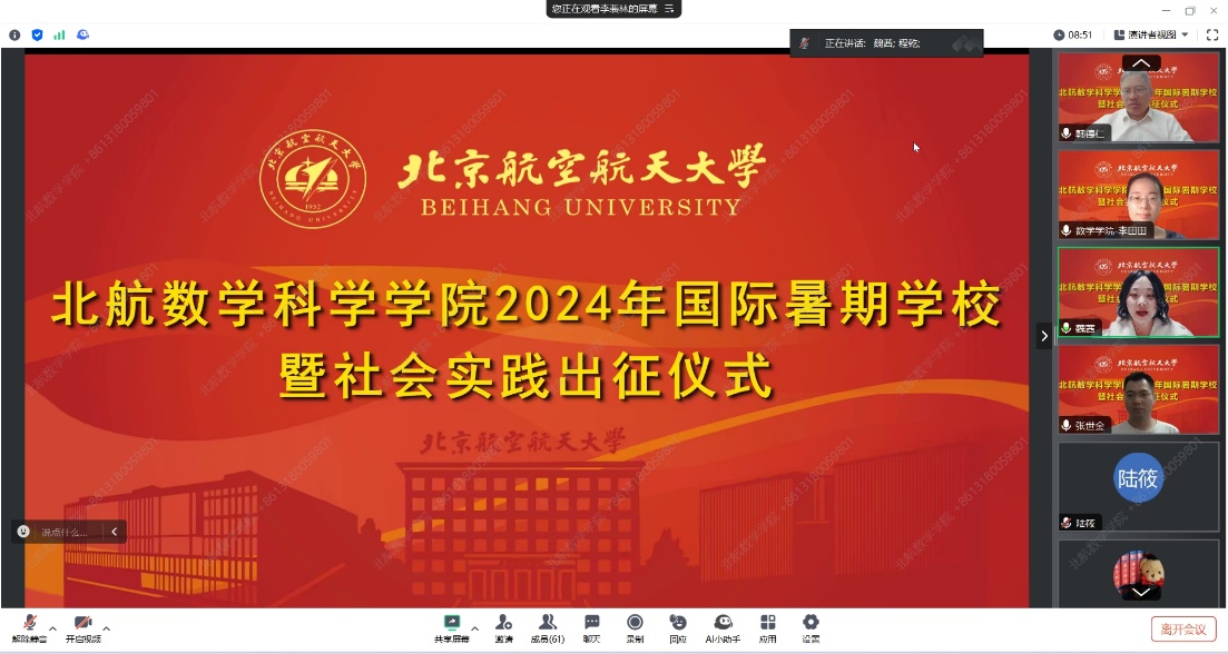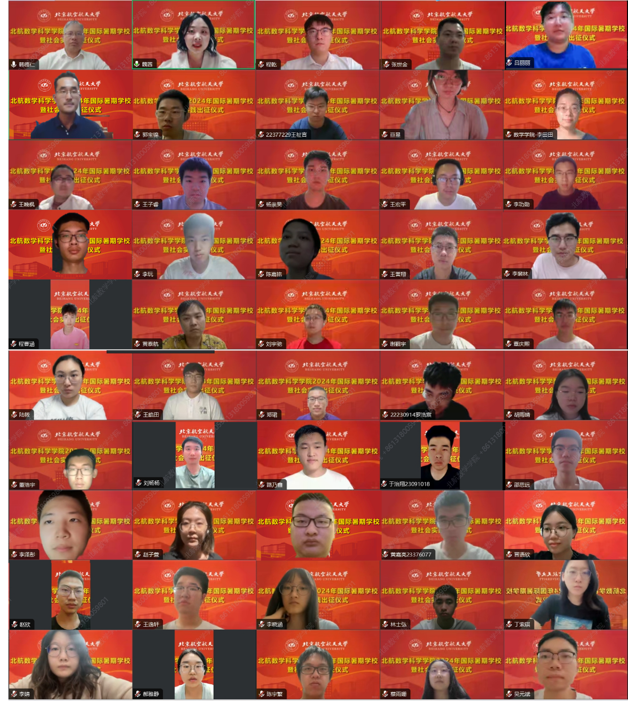 7月19日晚,澳门网投官方网站2024年国际暑期学校暨社会实践出征仪式于线上会议平台进行。学院院长韩德仁、党委副书记魏茜,暑期学校带队教师代表张世金、李田田、陆筱,社会实践队指导教师代表程乾,国际暑期学校和社会实践队学生代表等近60人参加仪式。本次出征仪式由魏茜主持。