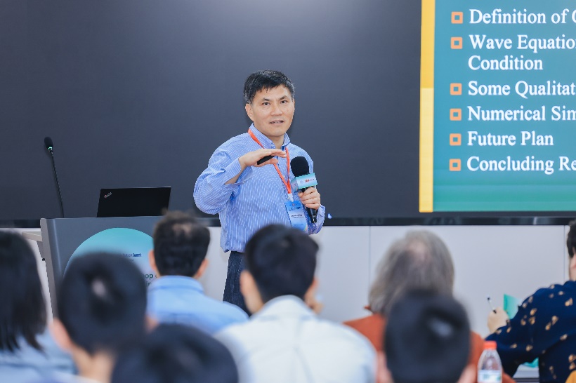 德克萨斯大学冯兆生教授主讲《具有范德波尔边界条件的波动方程的混沌振动》报告,使用特征线方法推导出由非线性边界条件引起的非线性反射关系,由此开发了定性和数值技术来处理三次非线性问题,并通过计算机图形展示了混沌振动的数值模拟和可视化。