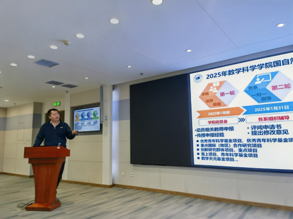 学院基础数学系主任戴蔚传达了学校国自然申报动员会的会议精神,对本年度基金委改革要点和要求进行了解读,并结合校院两级改革的目标,梳理了学院2025年国自然基金项目申报的时间节点。他表示,基金项目对于科研创新、学科建设和人才培养等方面具有重要意义,建议各位老师及早谋划、积极申请。