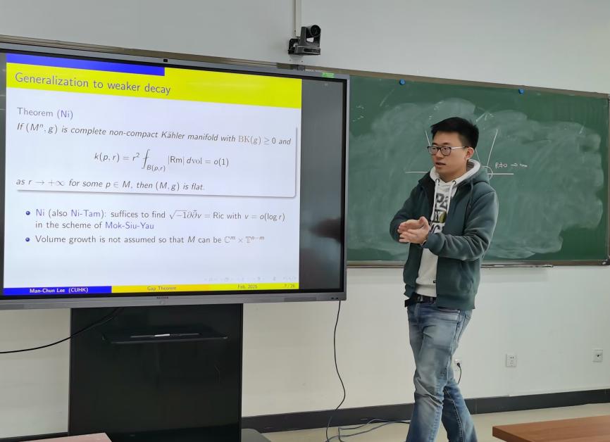 2025年2月20日上午,香港中文大学助理教授李文俊(Man-Chun Lee)受邀为澳门网投官方网站师生作了题为“Gap theorem on manifolds using Ricci flow”的学术报告,报告在E404举行,由张世金老师主持。这个报告也是数学学院微分几何讨论班(2025年春季)系列学术报告中的第2讲。