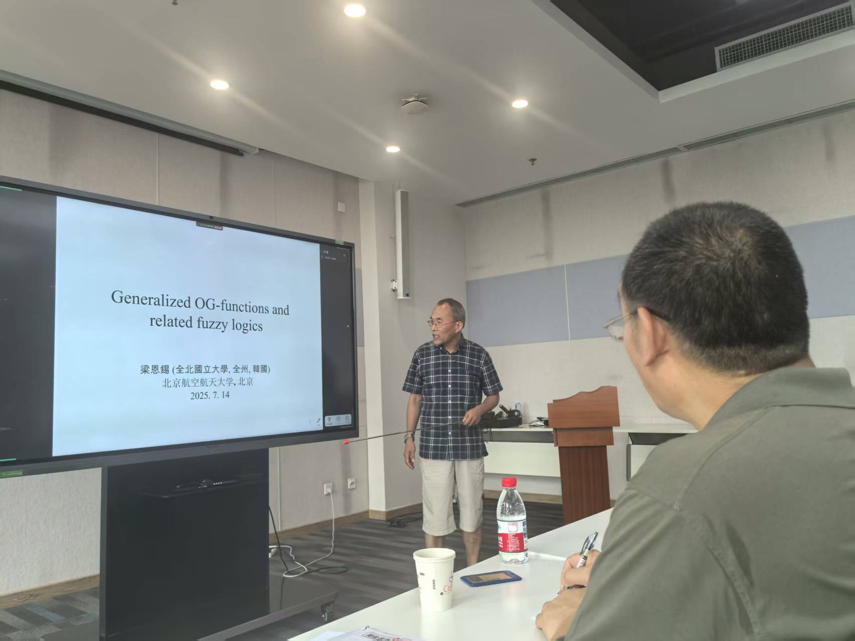 上午,梁恩锡教授在沙河校区E-806会议室作了题为Generalized OG-functions and related fuzzy logics的学术报告,十余名校内外专家和学生参加了报告会。梁教授系统介绍了其团队在模糊逻辑领域的最新研究成果,重点探讨了mcanorms、GOG函数等非经典逻辑运算的性质,并建立了相关逻辑系统的代数语义与完备性理论。报告内容深入浅出,引发了与会者的热烈讨论。