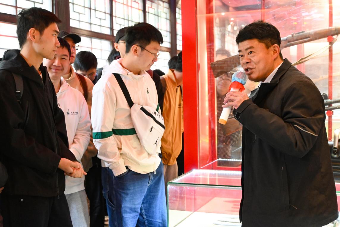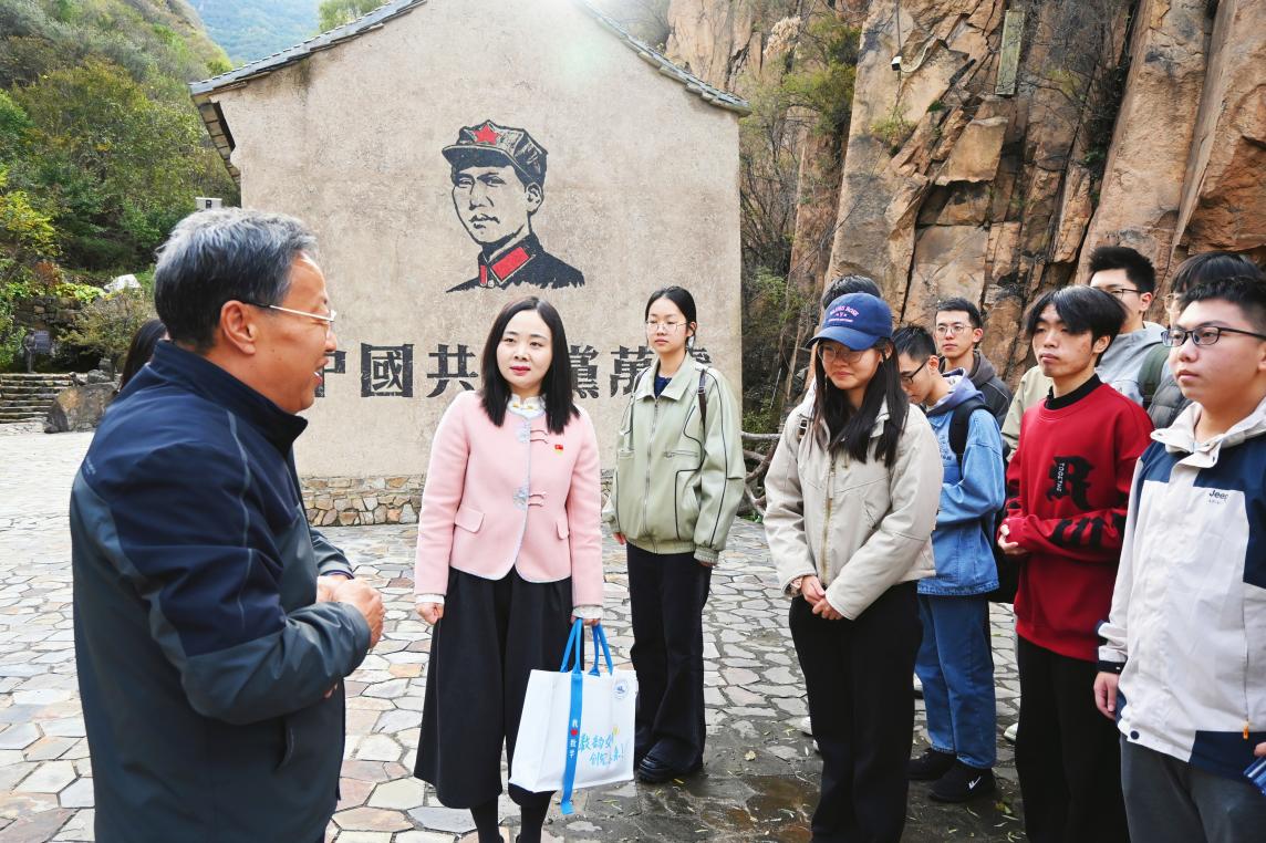 邢卫兵书记带领师生深入参观炭厂村爱国主义教育基地,走访村内特色创业项目,近距离观察乡村产业发展模式。邢书记用“红、绿、黑”三色特色旅游路线总结炭厂村在红色教育宣传推广、生态旅游绿色发展等方面的实践经验与未来发展规划。
