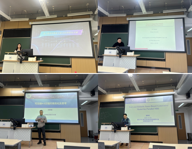本次研讨会邀请了来自多所知名高校的专家进行学术报告。上海大学彭亚新教授系统介绍了物理信息神经网络在PDE求解、多物理场建模及反问题中的最新进展,并剖析了当前面临的挑战。北京大学黄得教授深入阐述了三维Euler方程组有限时间光滑自相似解的爆破理论、数值方法及计算机辅助证明,并详细介绍了流体奇点形成的关键数值方法思想和近期多尺度自相似爆破的数值结果。澳门网投官方网站刘铁钢教授分享了基于高阶间断伽辽金方法的可压缩气动优化框架,展示了其在翼型减阻与反设计中的高效性能,并探讨了当前可压缩Navier-Stokes优化中存在的关键问题。广州南方学院曾铁勇教授介绍了具有收敛保证的稀疏角CT重建算法、基于深度去噪先验的MRI重建方法及参数更新的去噪融合网络框架。